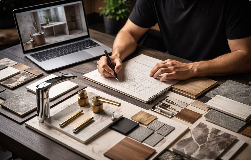 We design using products we stock and trust, including tiles from Tiles & Beyond and bathroom products from Bathroom Discount Centre. This ensures availability, value, and reliable lead times.