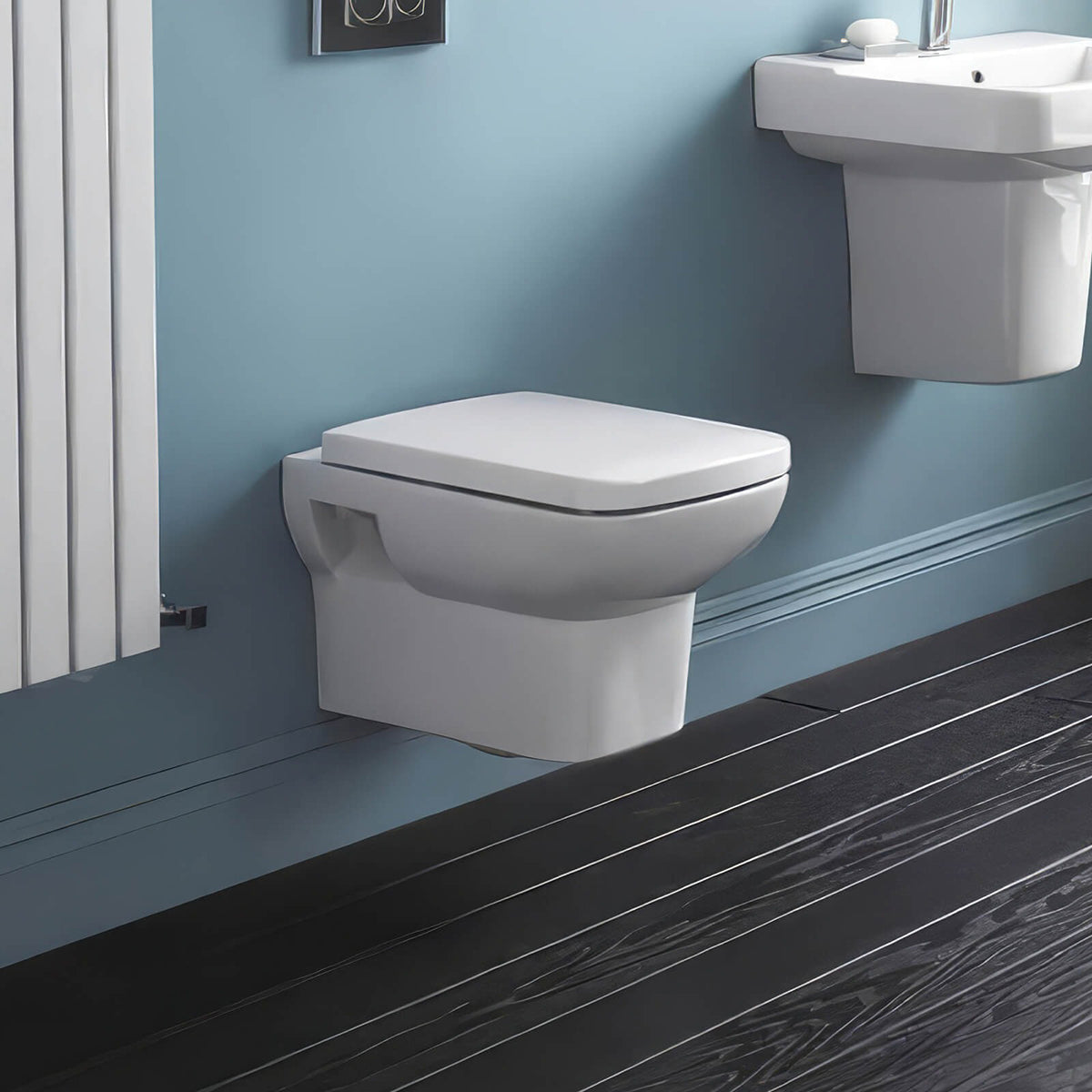 This wall-hung toilet is easy to install and clean, making it a great space-saving choice for contemporary bathrooms.
