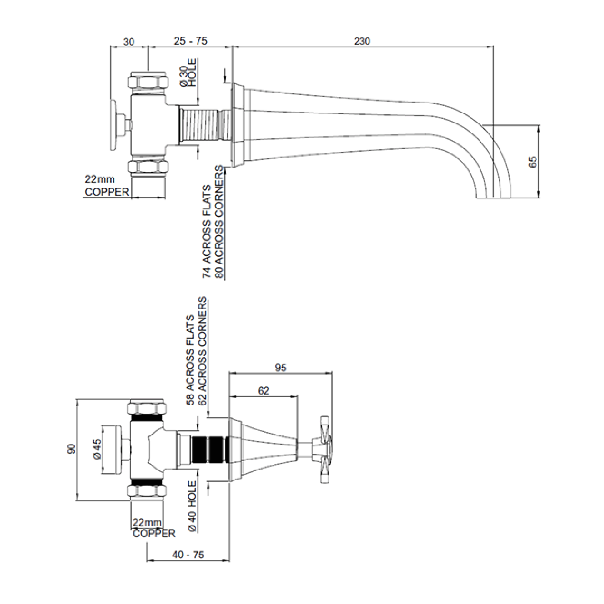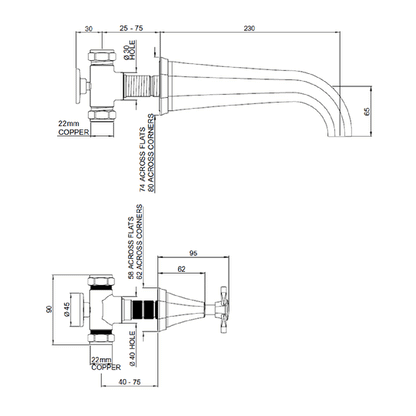 The Perrin & Rowe 3-hole Wall Mounted Bath Filler Tap is constructed from high-quality low-lead brass, it is designed for lasting performance. This bath tap has a 1/4 turn ceramic disc flow control ensuring smooth operation.