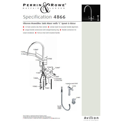 The Perrin & Rowe Oberon - C Spout 4866 (with Rinse) Kitchen Tap is crafted with a pull-out spray rinse, making it highly functional and convenient for various kitchen tasks.